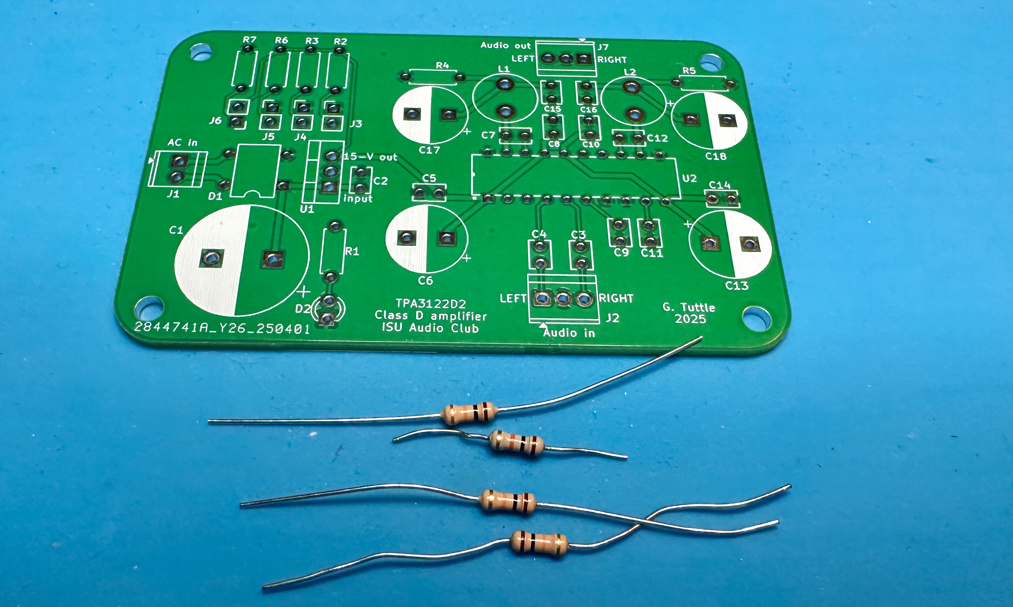 - As usual, we start with the small components and work towards the bigger parts. Solder in the four 10-kΩ resistors, labeled R2, R3, R6, and R7. These are the pull-up resistors used in selecting the gain and activating the mute and shutdown functions of the chip.