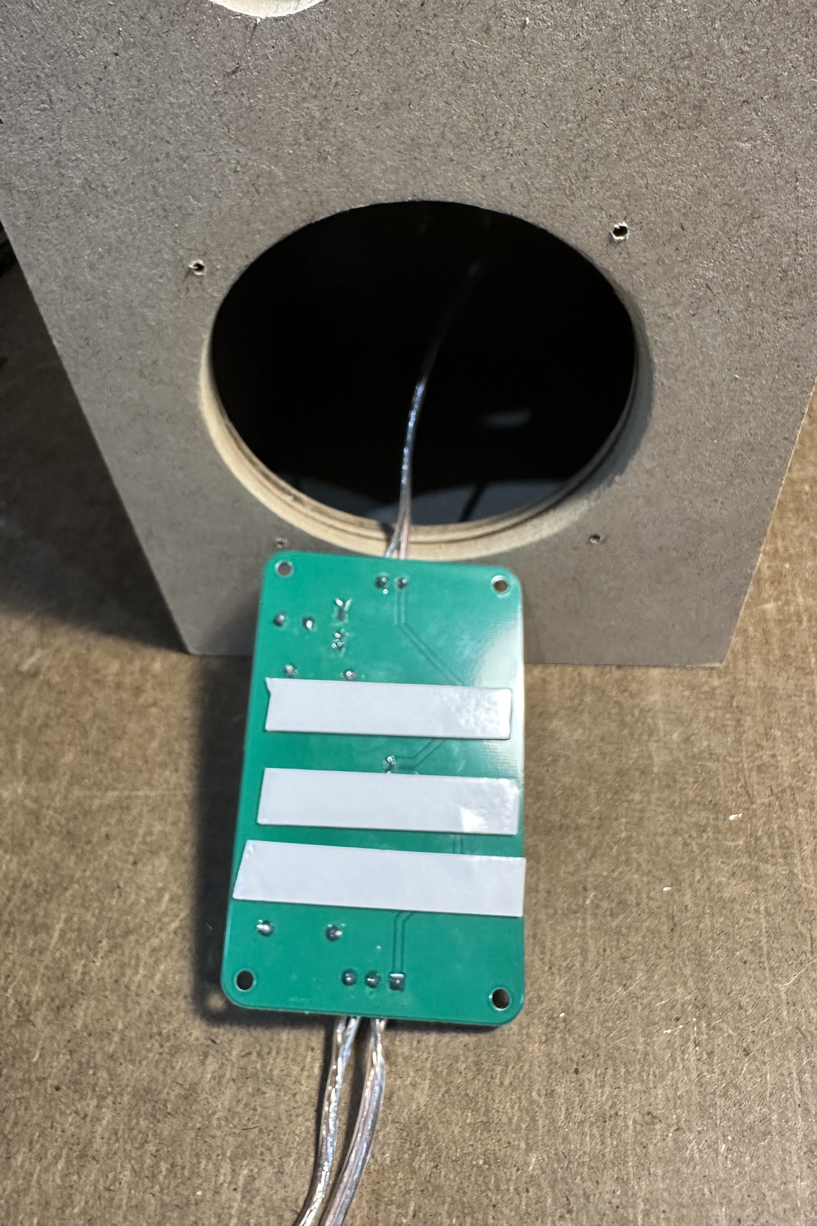 - Peel off the backing from the tape and stick the PCB to the bottom of the box. If the box has dust or debris, the tape will not stick well!