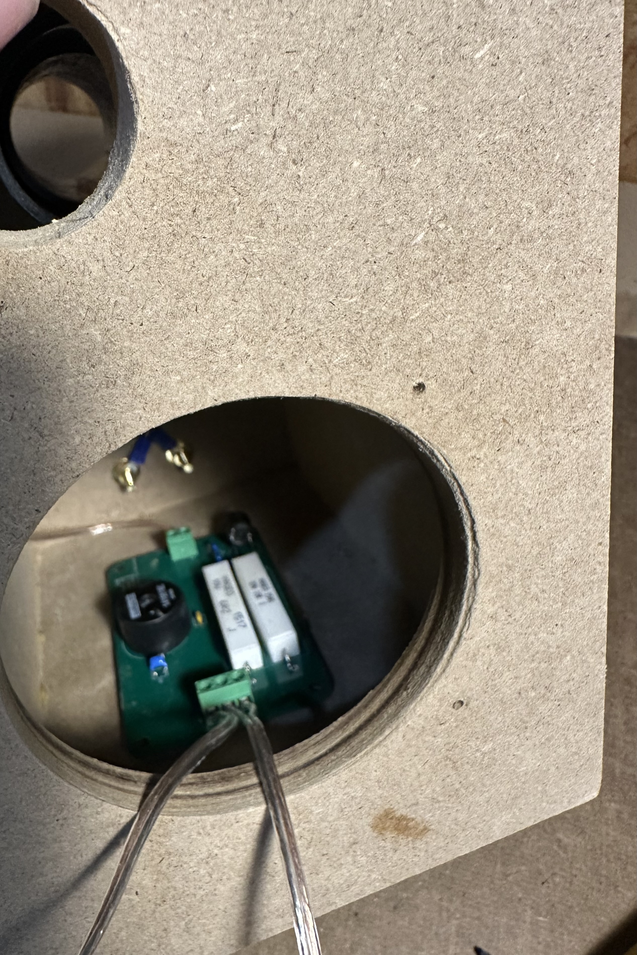 - Attach the speaker wire coming from the binding post to the input of the cross-over circuit. Again, be consistent with postive and negative. Trim the wires so that there will no exposed wire at the connector — exposed wires might short together when the wire is flexed.