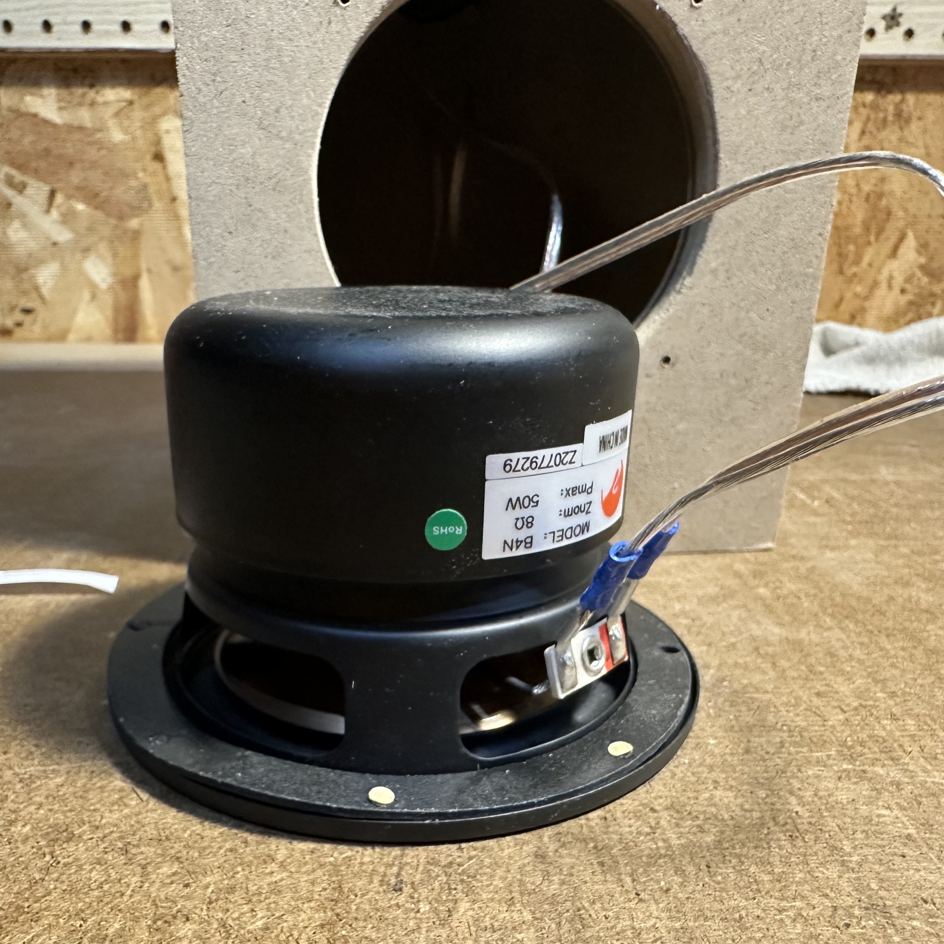 - Set the speaker on its back. Remove the paper from the gasket and stick it down so that four of the holes align with the holes drilled earlier. Set the mid-range into the opening and install four screws to secure it.