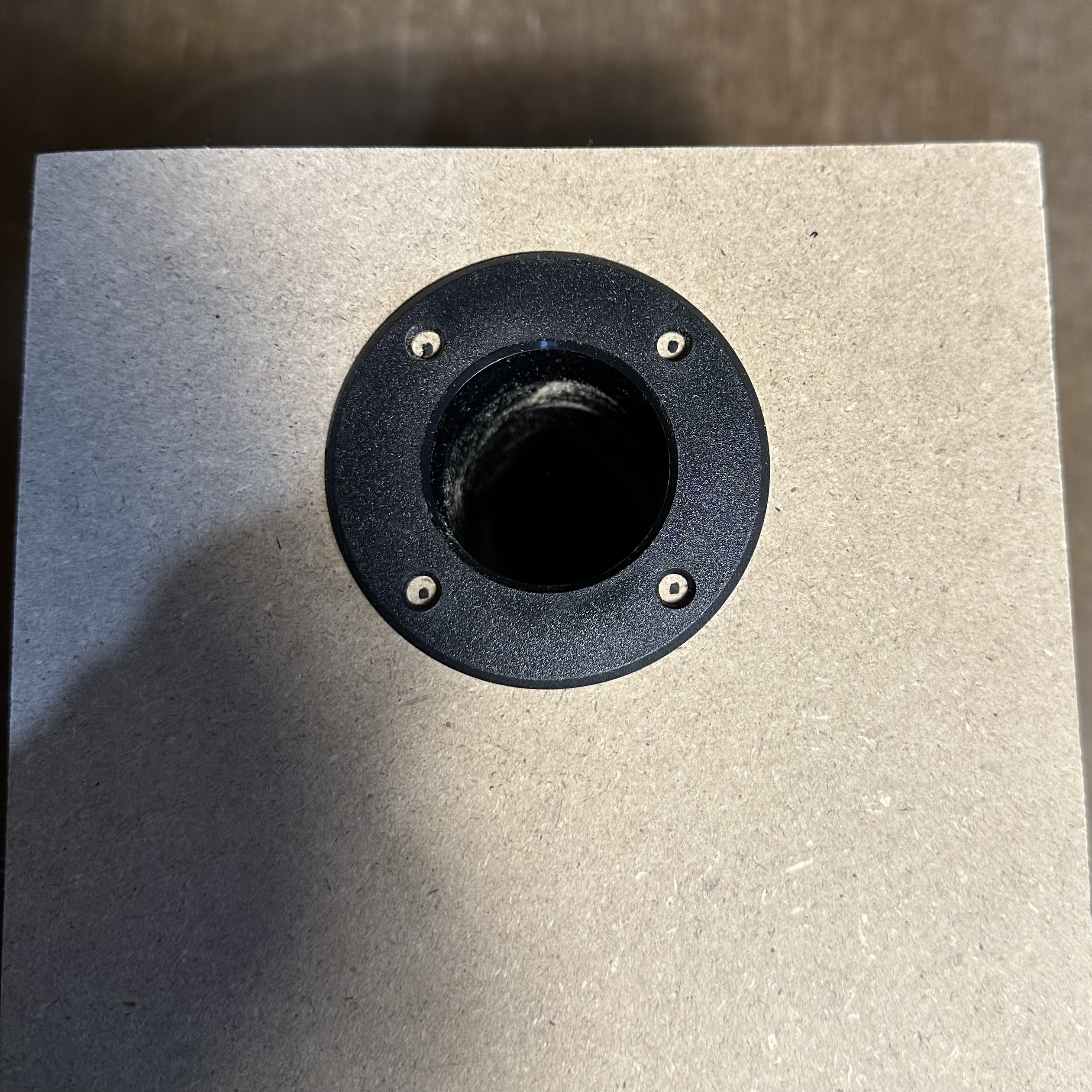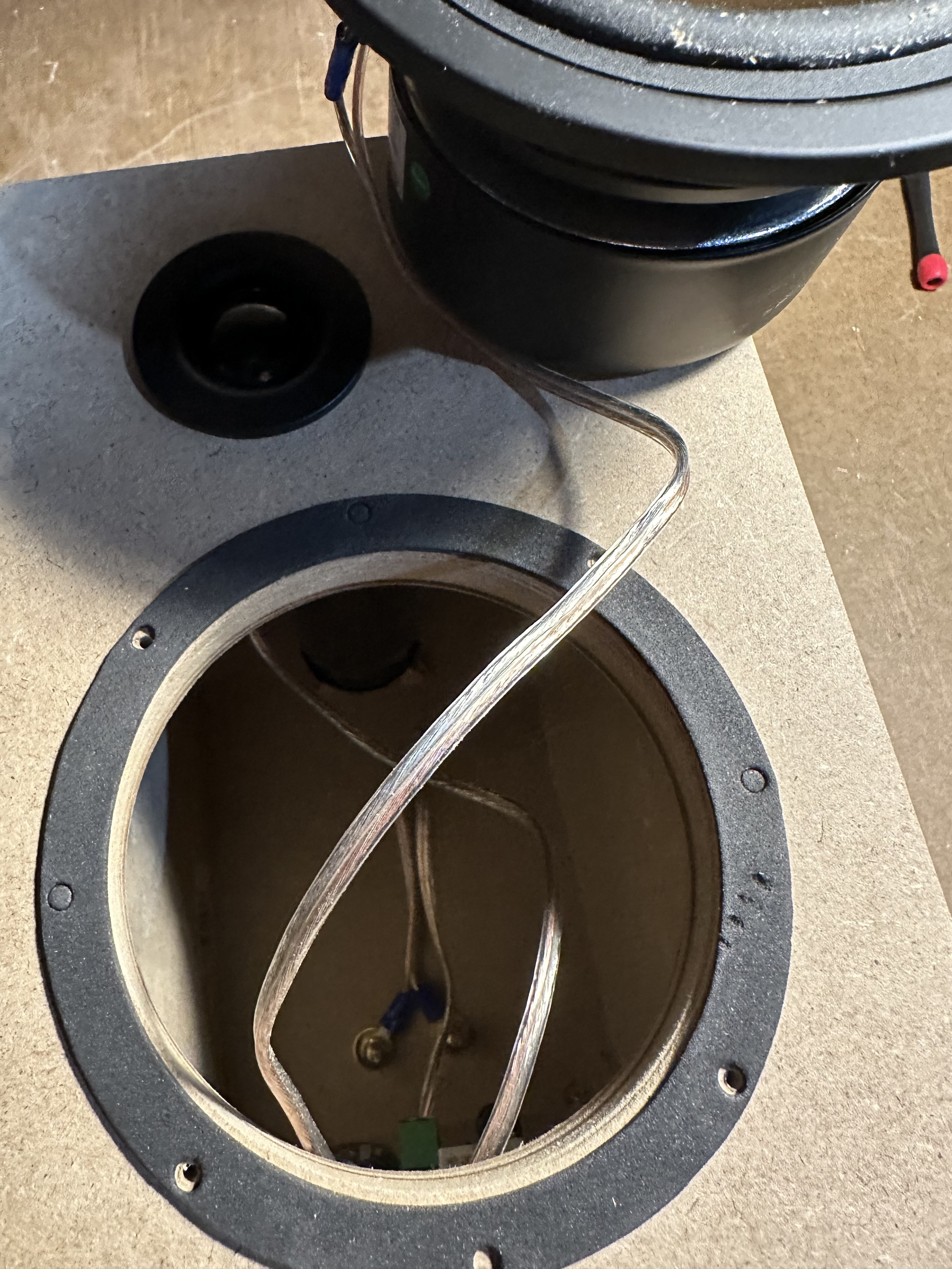 - Insert the outer port tube through the port hole and mark four locations for the four mounting holes. Do the same for the mid-range driver on the front.