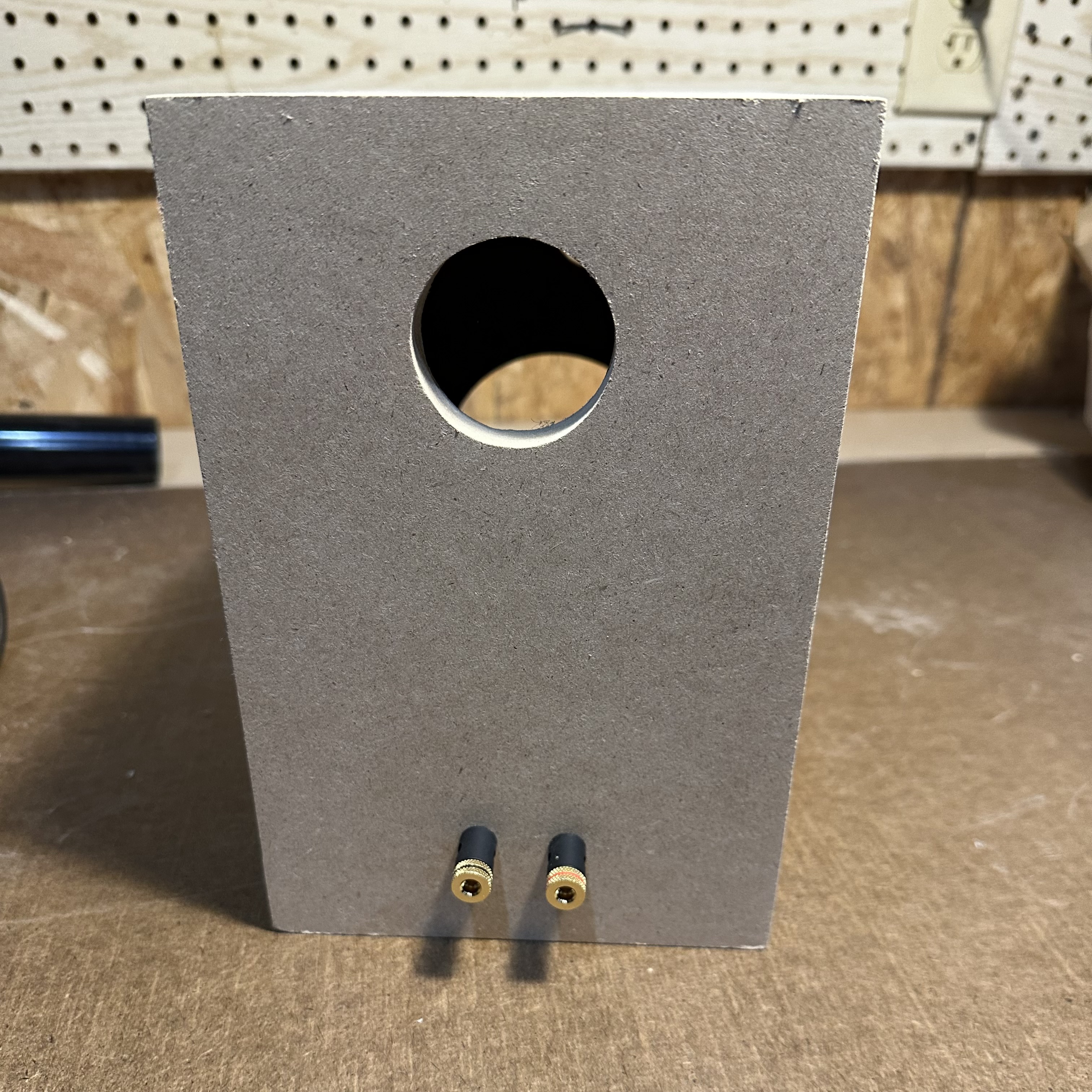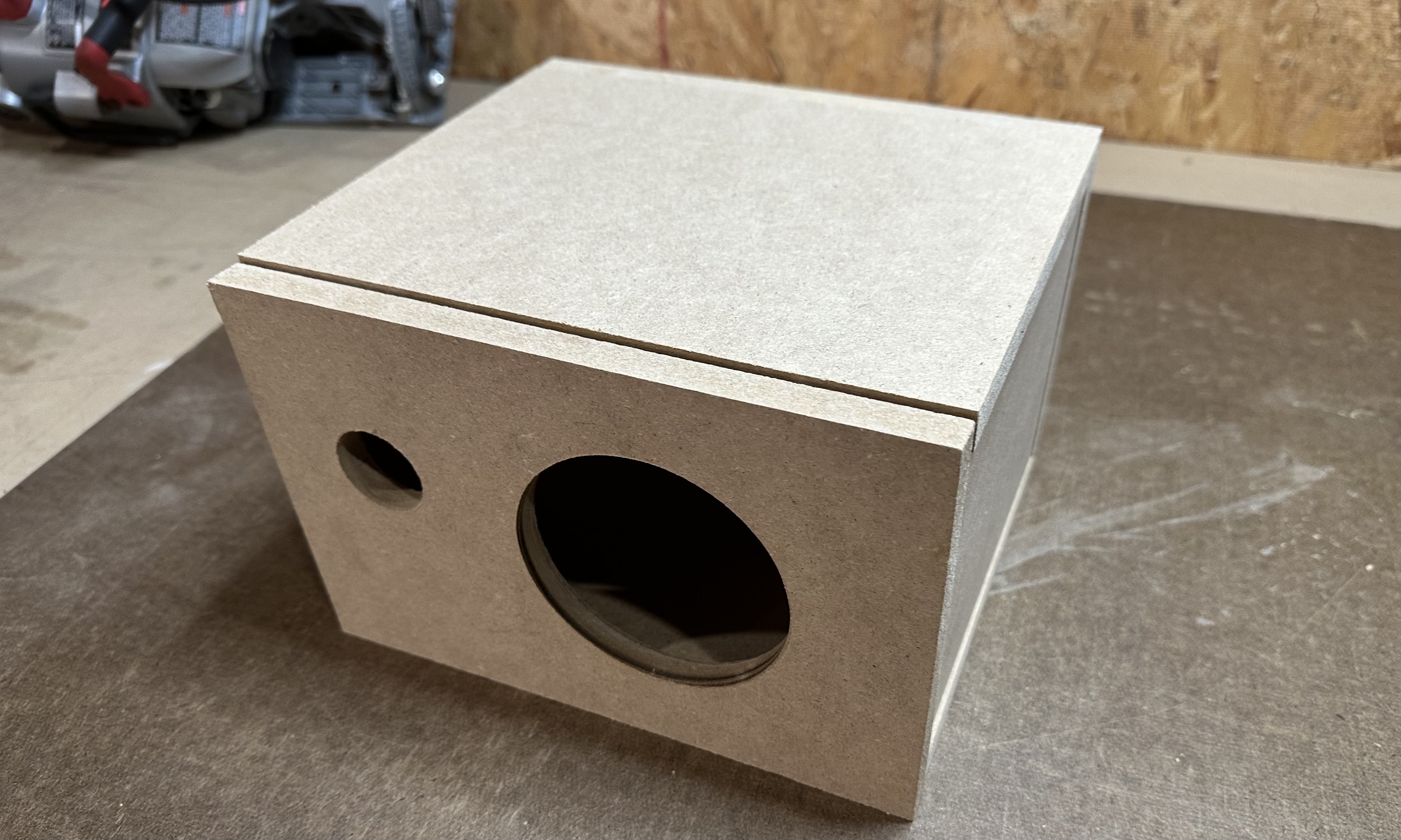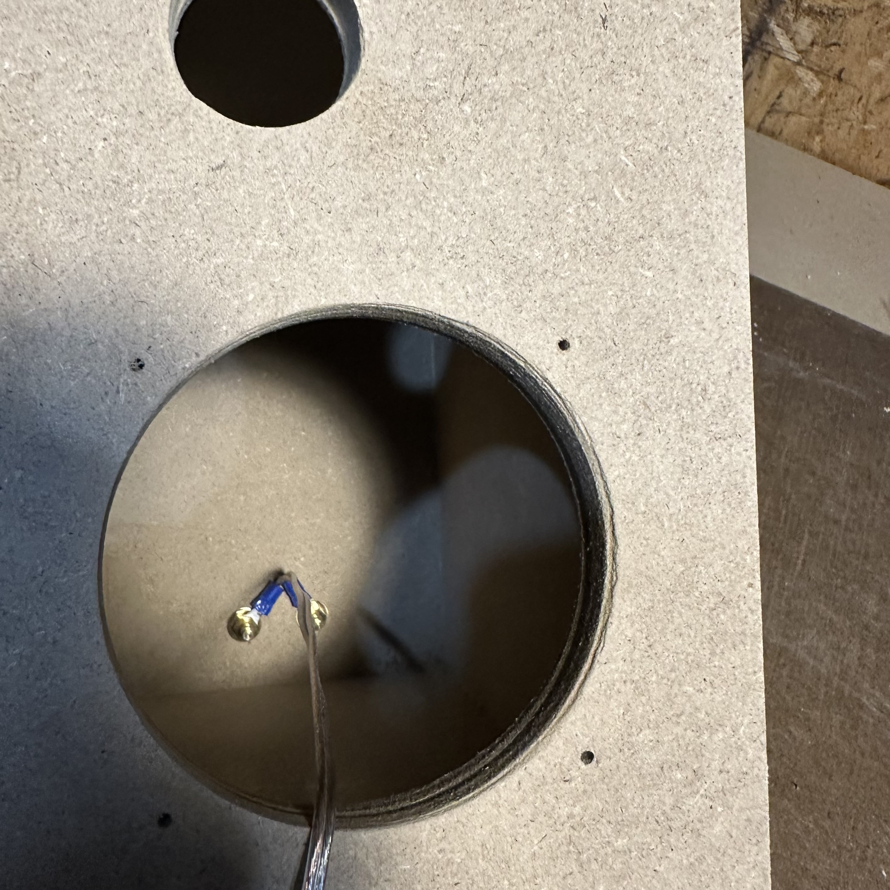 - Drill pilot holes in the marked locations for the mid-range and port tube using a small bit, maybe 3/32 or 5/64.