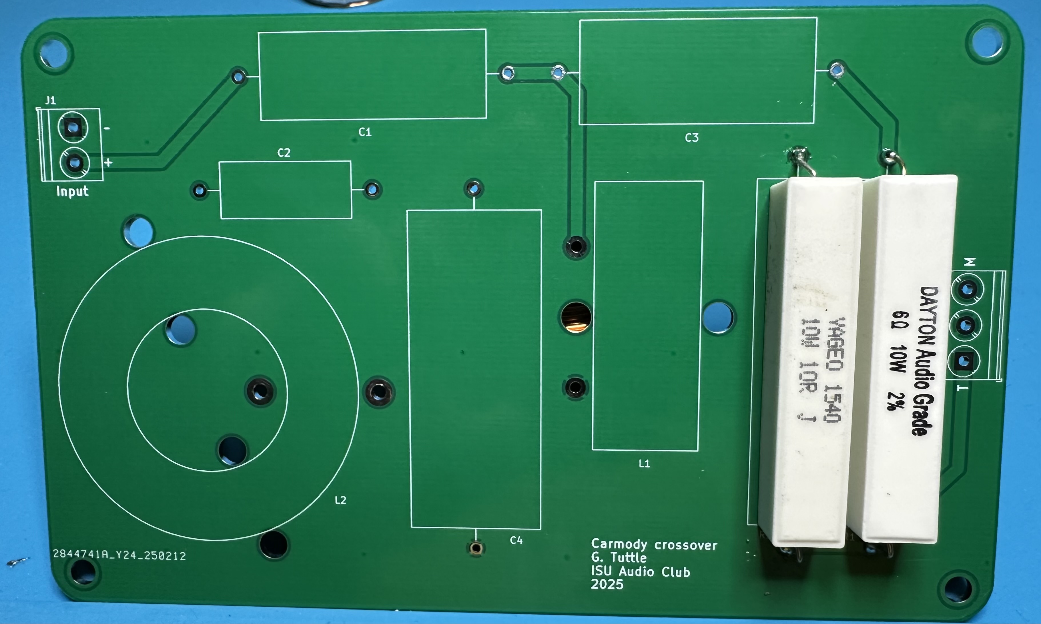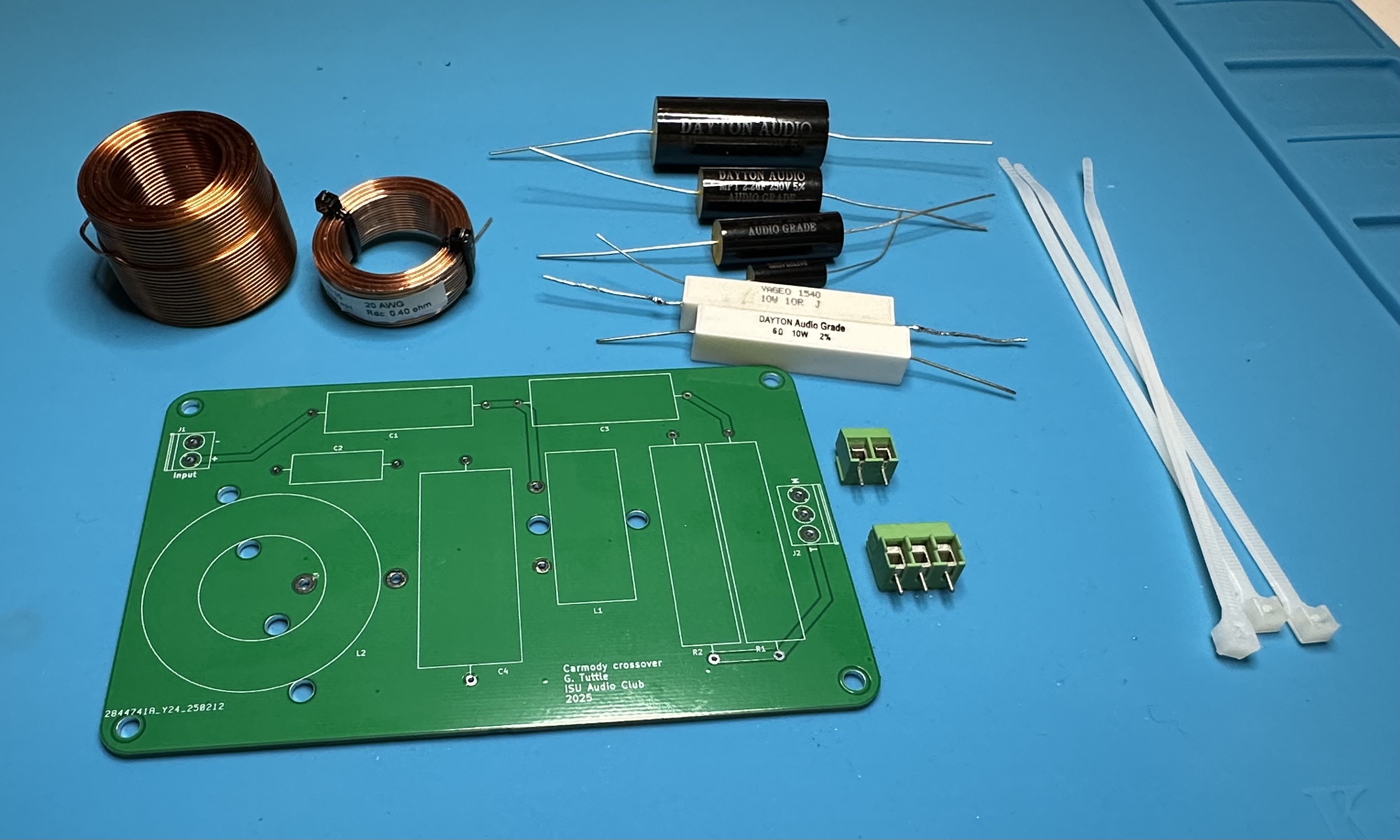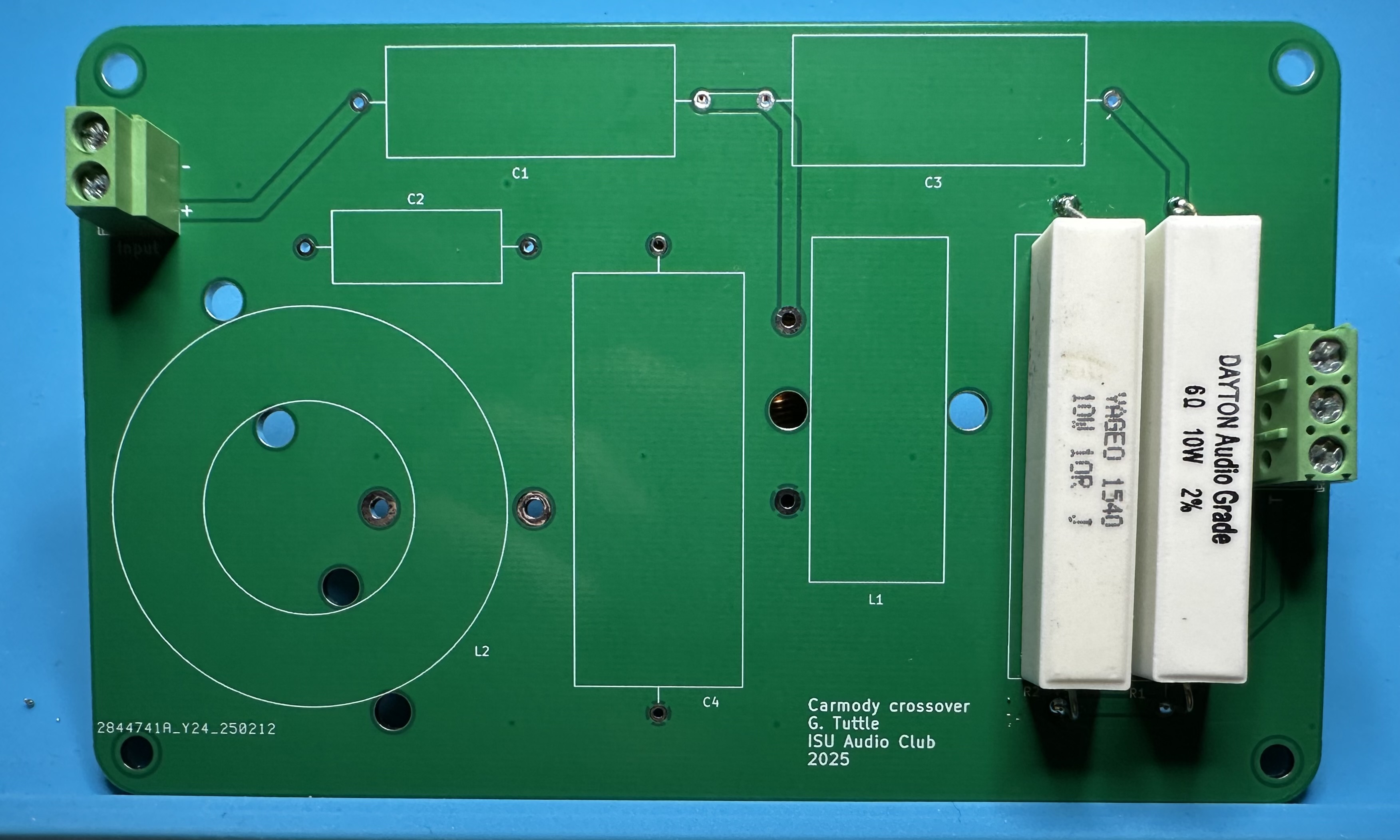 Special note for Fall 2025/Spring 2026 builders: I made a slight change to the PCBs recently, and there is a subtle difference between the old and new versions. The older version used one 2-postion terminal block — for the input — and one 3-position terminal block — connected to both mid-range and tweeter. The newer version uses three 2-position terminal blocks — one for the input, one for the mid-range, and one for the tweeter. Depending on how the board supply is depleting, you may have received the older version. The two different versions function identically. The only difference is during the final assembly when connecting the PCBs to the speaker drivers. The photos used below were taken using the older version, so the instructions and the photos may not match exactly.