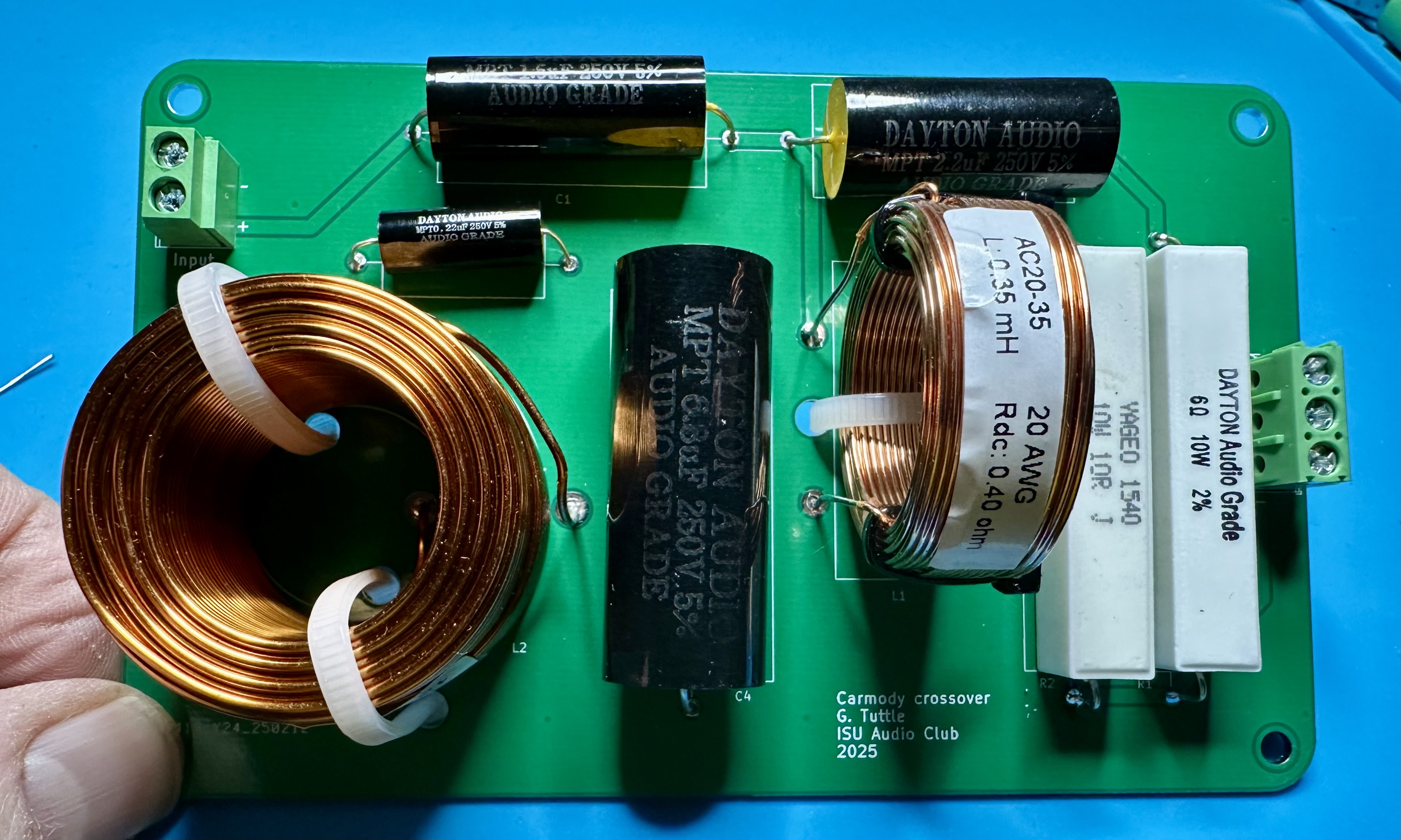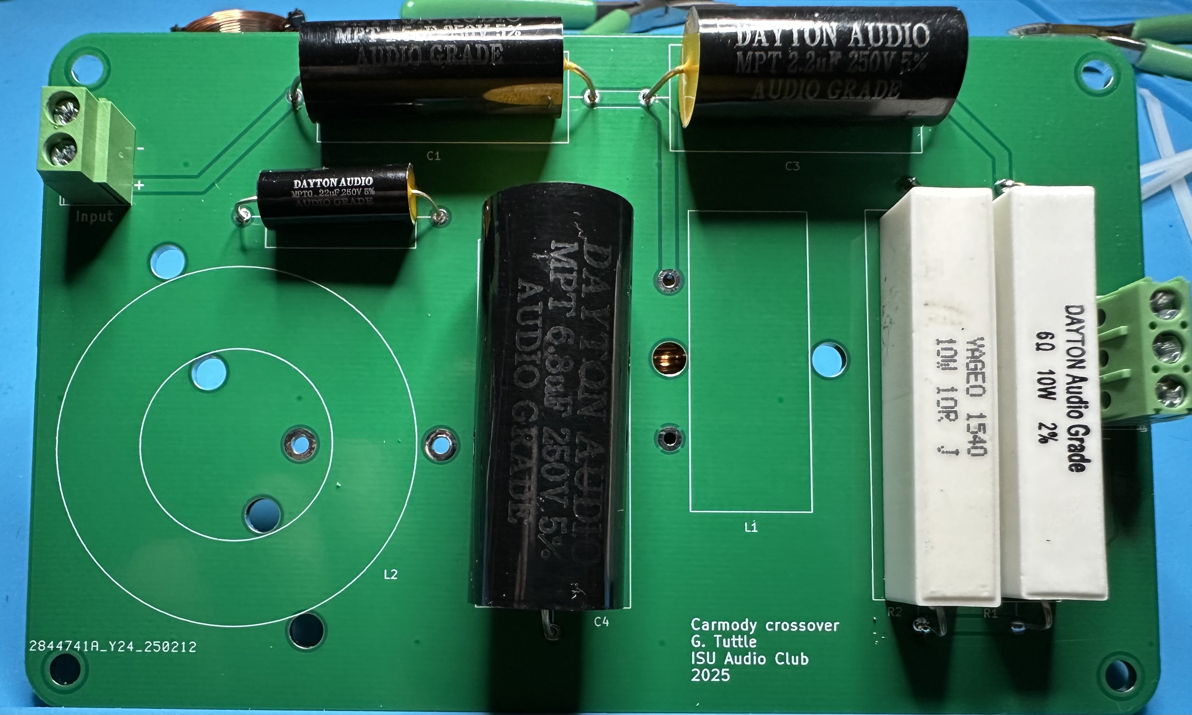 If you've built any of the other club projects, soldering together the cross-over circuits should be a piece of cake. The only difference is that the components for the Carmody circuit are quite a bit larger that most of the things we have worked with in the past. Note that you will need two complete PCBs, one for each speaker.
