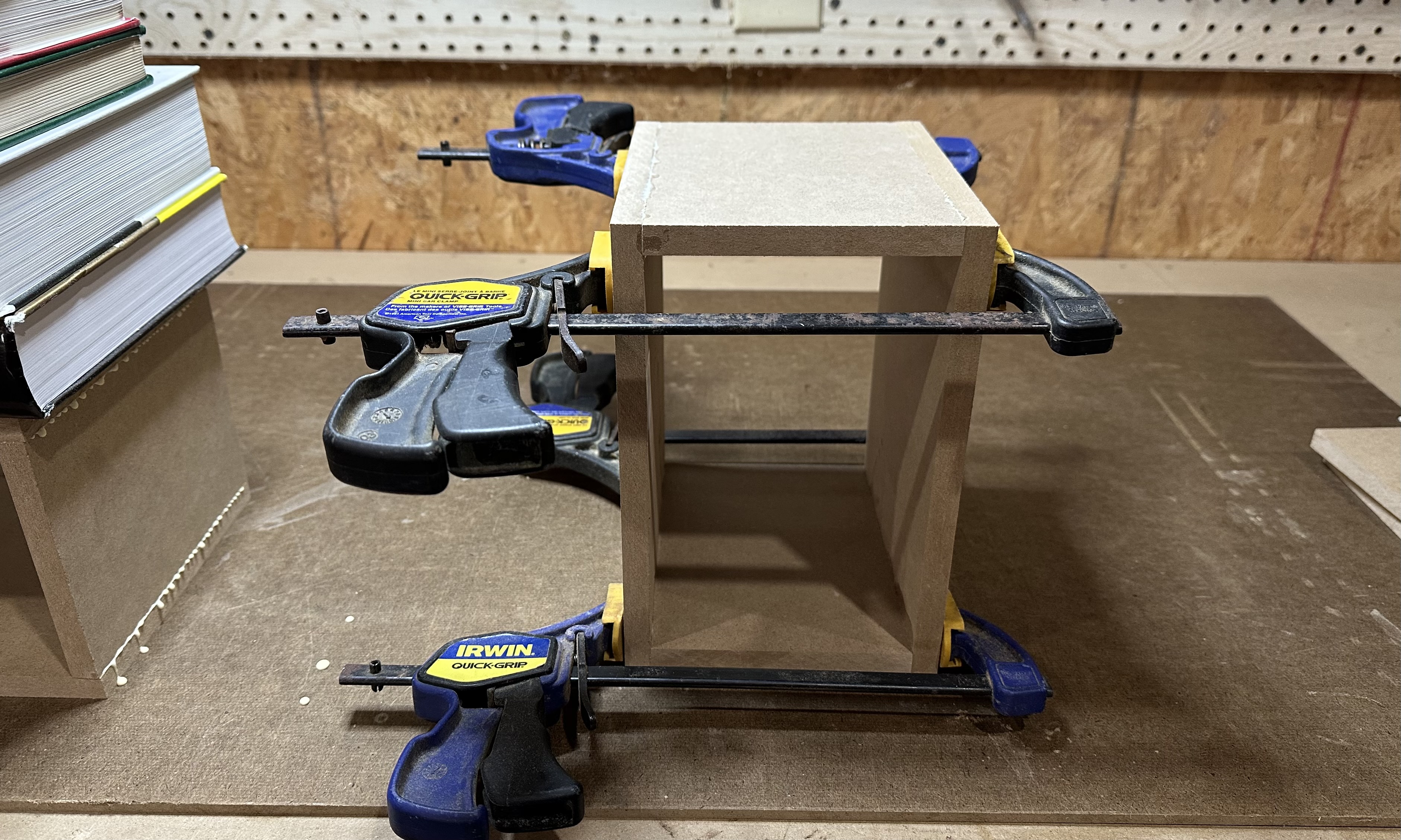 - If using clamps to hold everything together, carefully set the box up upright, as shown below. Apply the clamps and partially snug them down. Make adjustments to the front and back panels so that they are aligned to the box as best you can. Then tighten the clamps down all the way. Be prepared to wipe up excess glue that is squeezed out of the joints as pressure is applied.