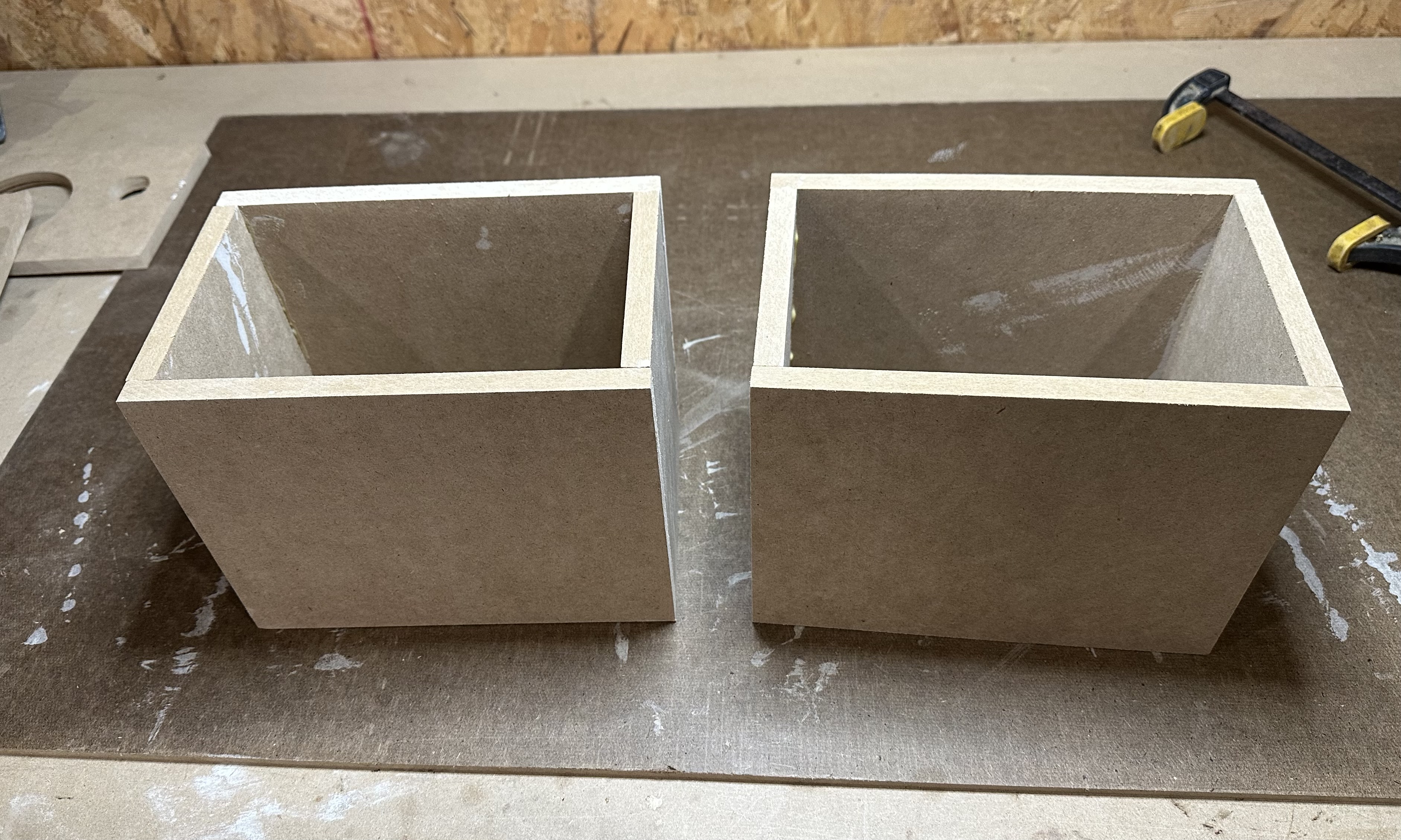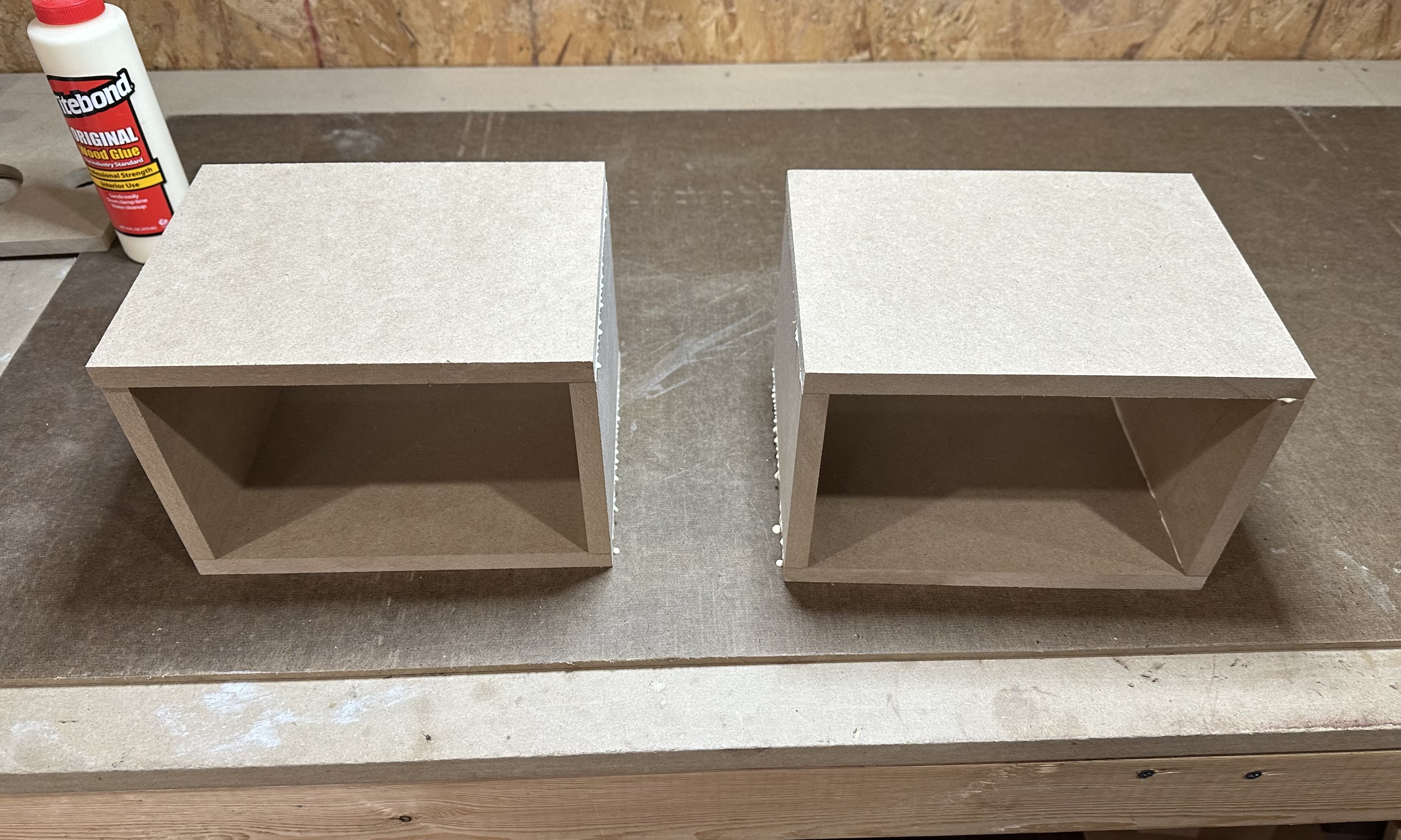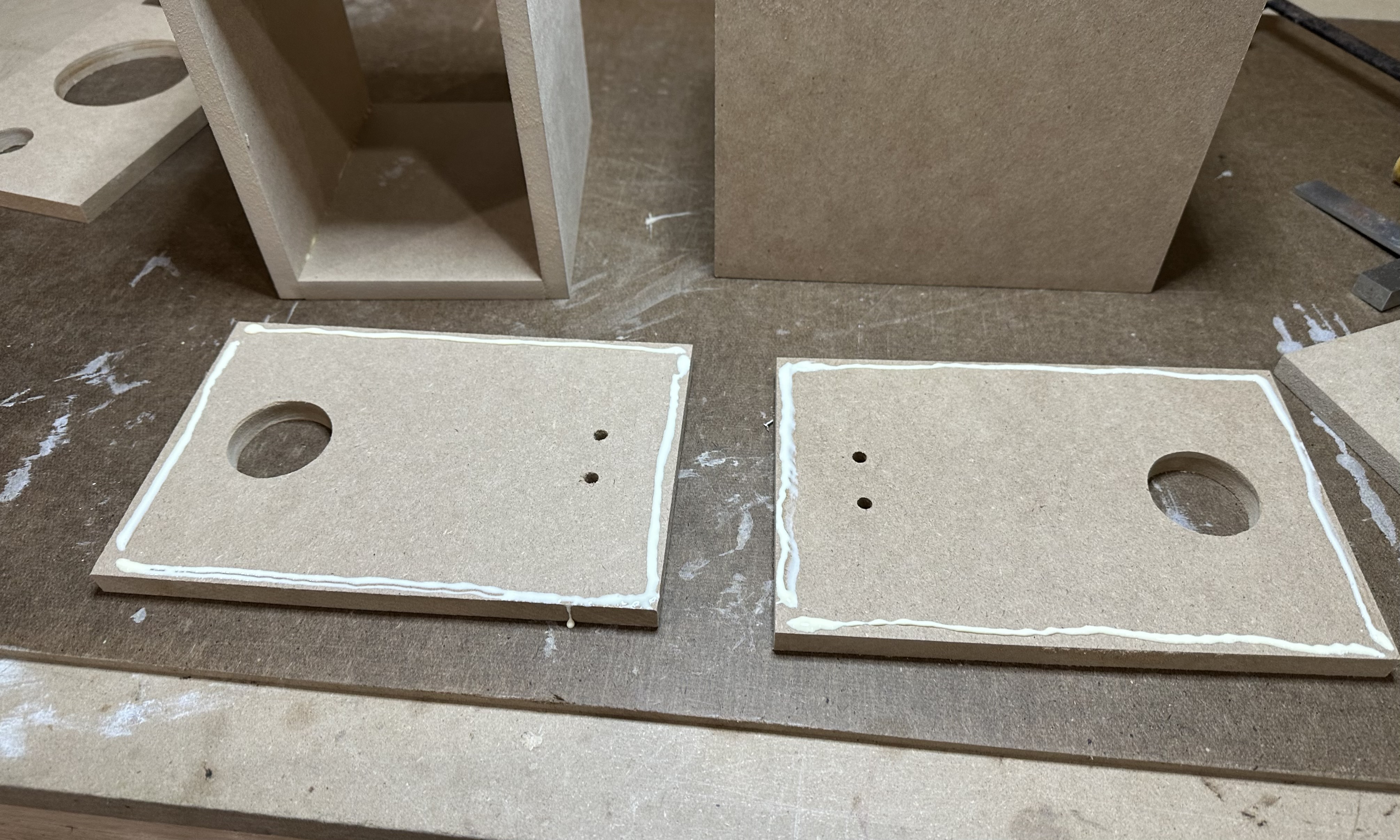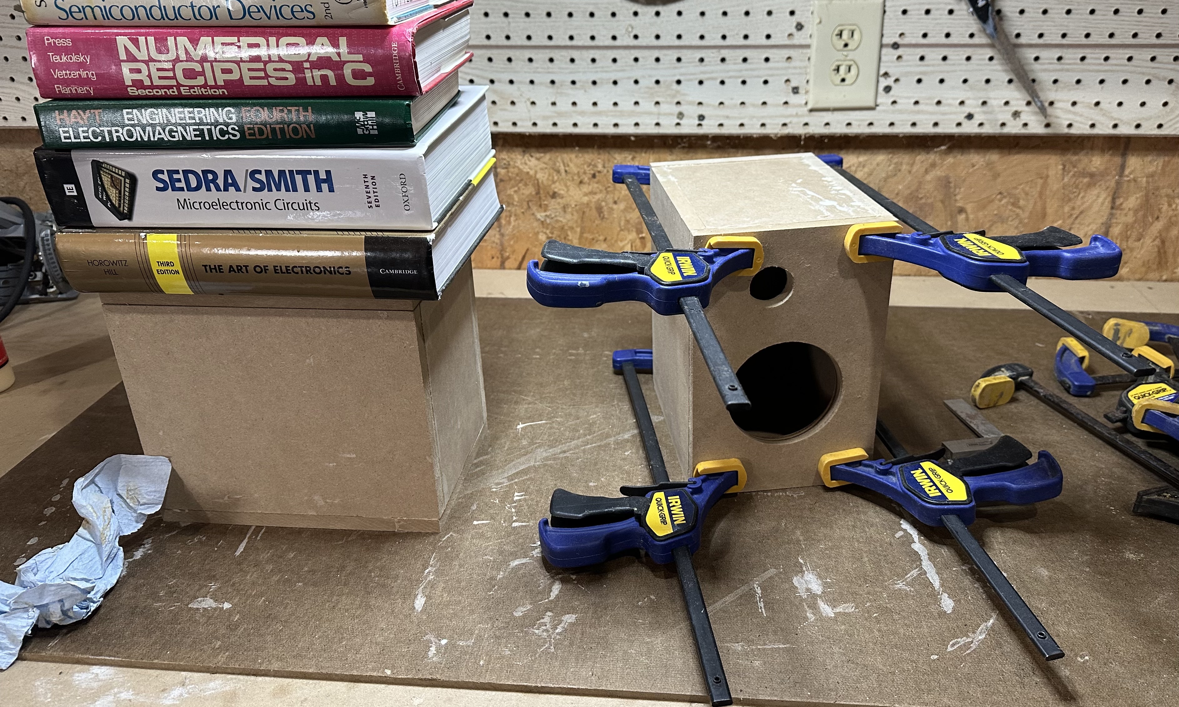 The speaker project requires two identical speaker boxes. Probably the best approach for the inexperienced is to do them one at a time rather than in parallel. The text of the instructions below is written with the assumption that the two boxes are being done sequentially. However, the photos show the two boxes being at the same time in order to show the use of both weights (in the form of a stack of text books) and clamps to hold the boxes together as the glue dries.