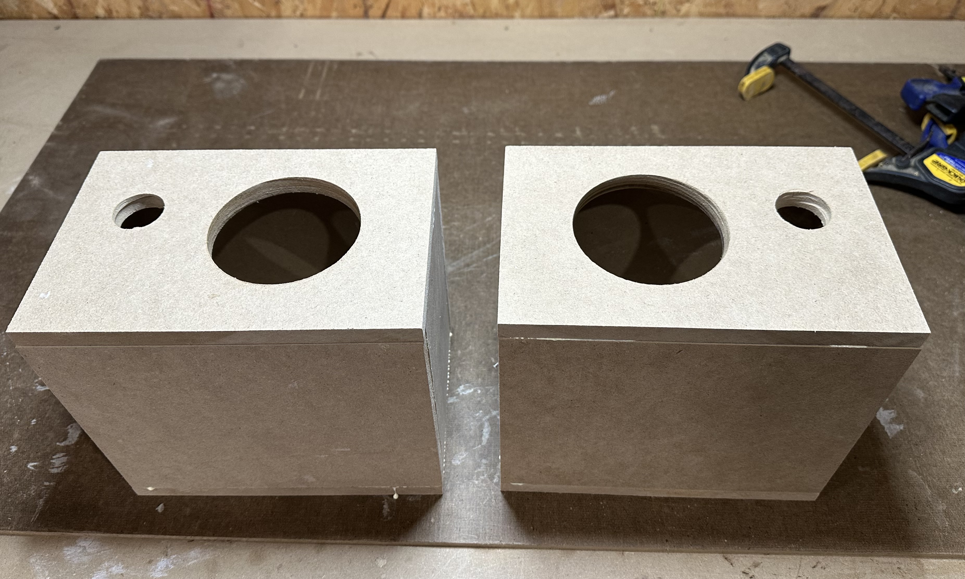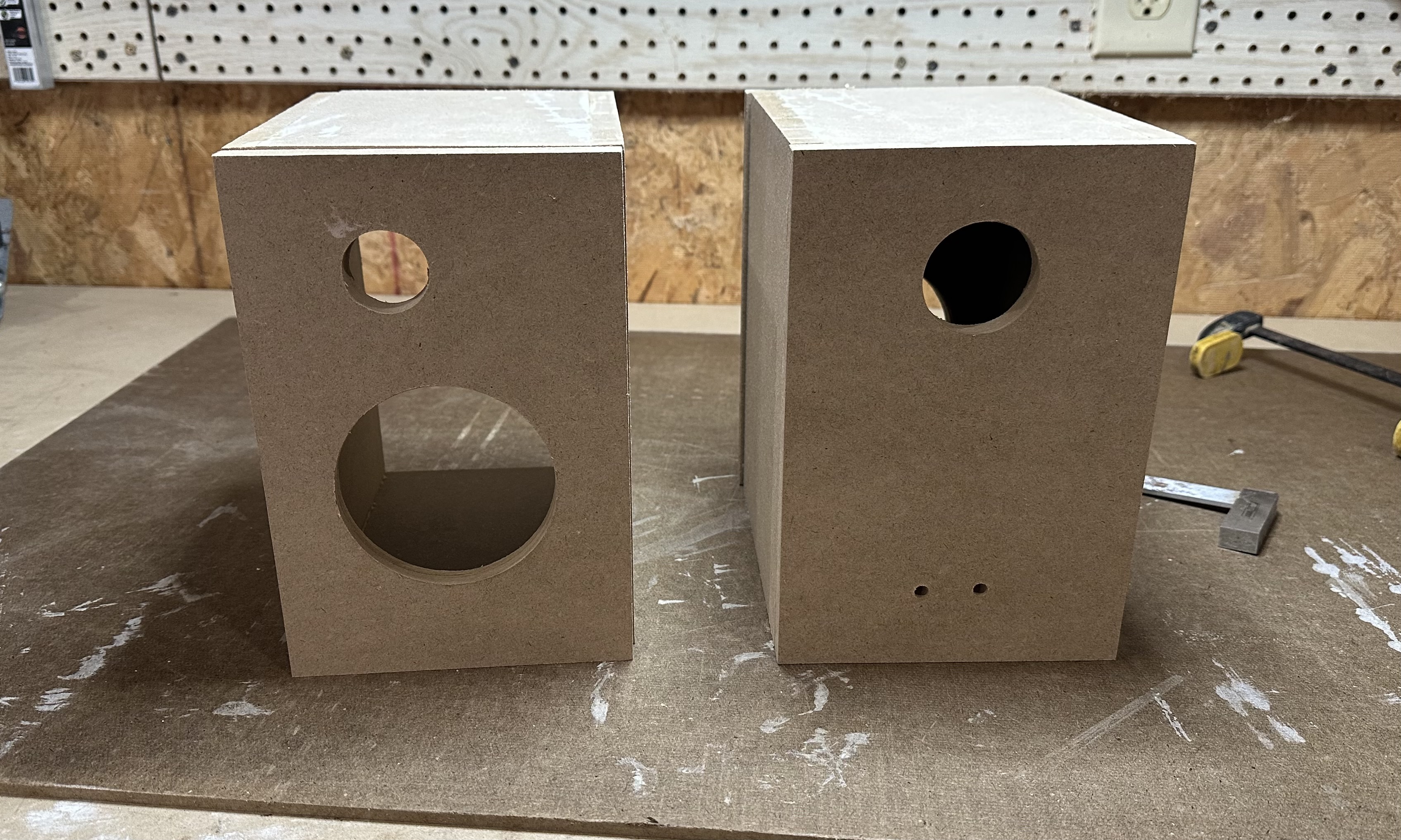 - Test fit the front and back panels. Note the arrangement — the larger opening for the mid-range on the front panel should be "down" and the larger opening for the port tube on the back panel should be "up" so that the mid-range and the port tube don't interfere with each other. On one speaker the tweeter opening should be to the left and the other speaker it should be to the right. (This is for aesthetics only.)