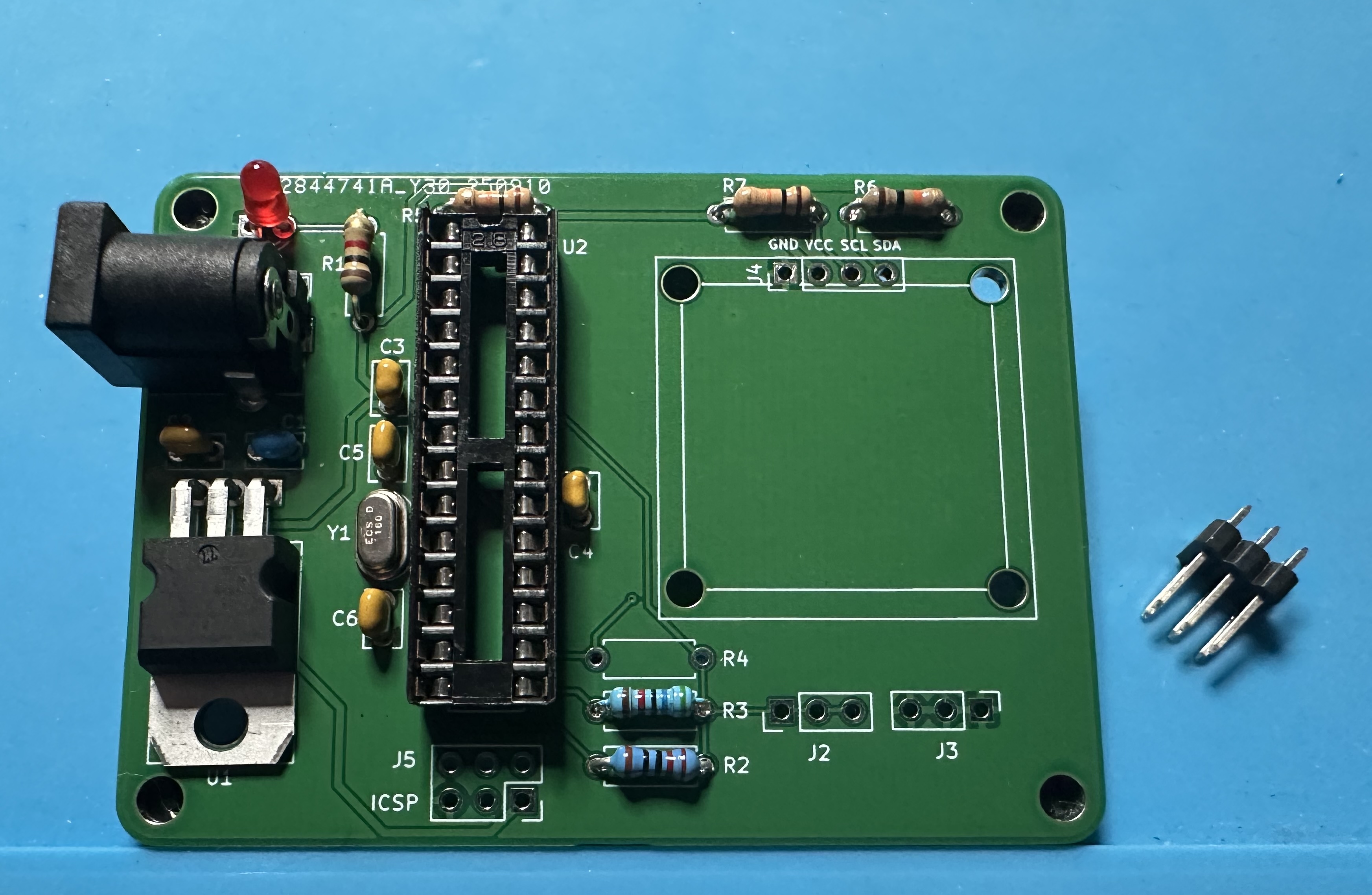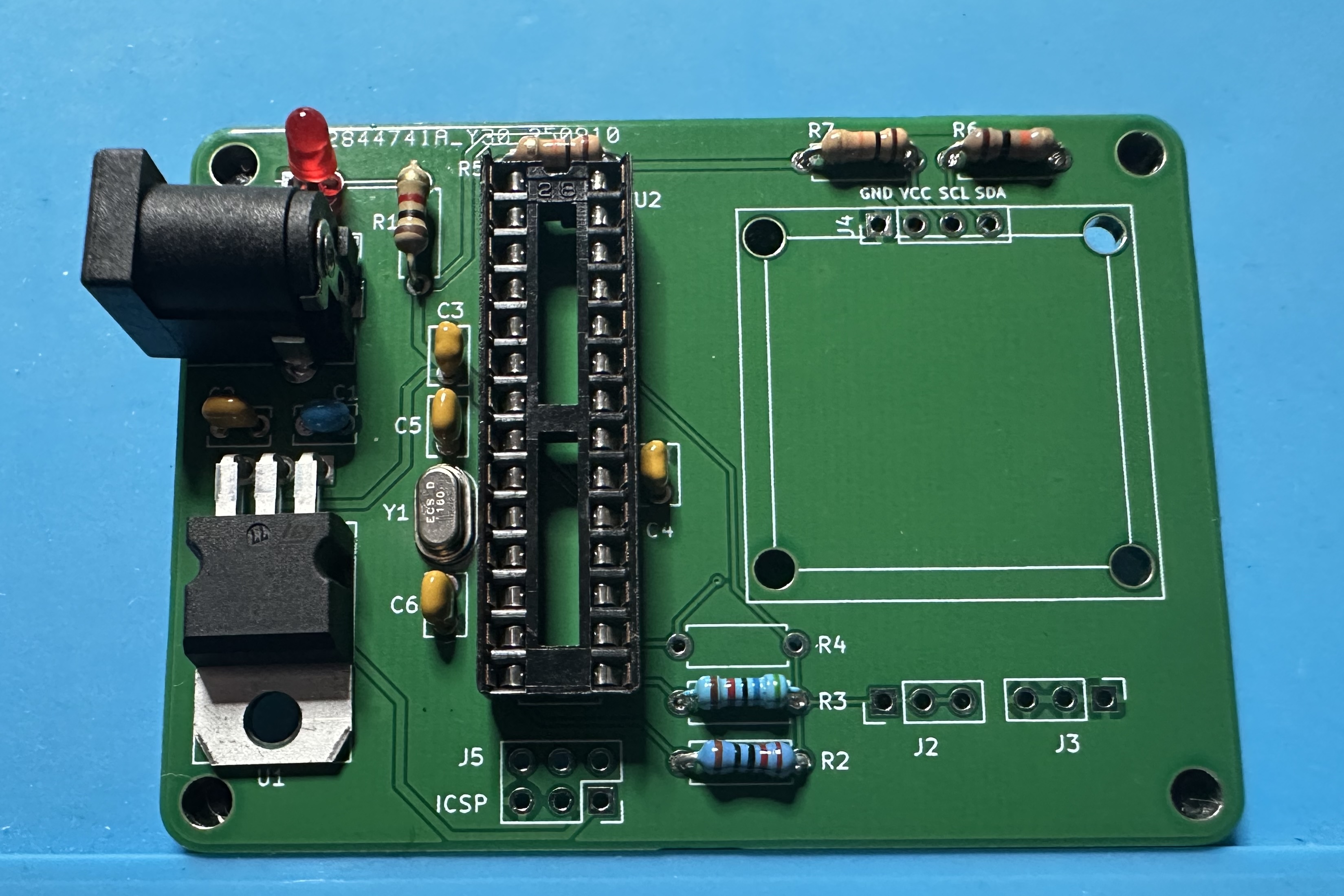 - Next up, add the chip socket — (U2) for the Atmega chip. This one is tedious — 28 pins. Solder one pin and check the alignment. Then take a deep breath and start soldering the other 27.