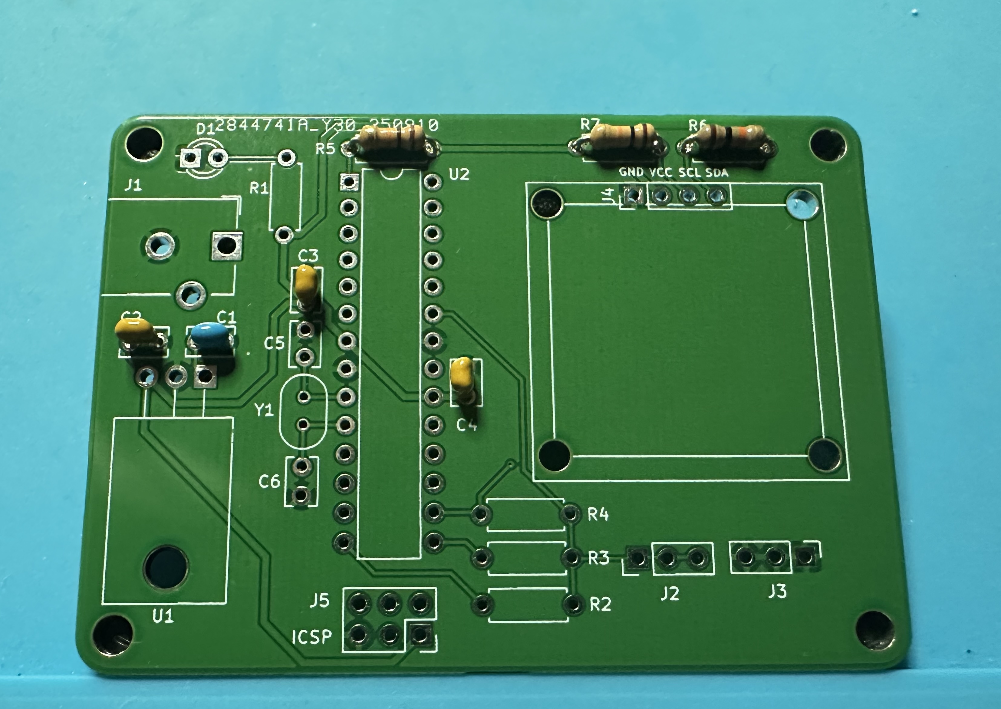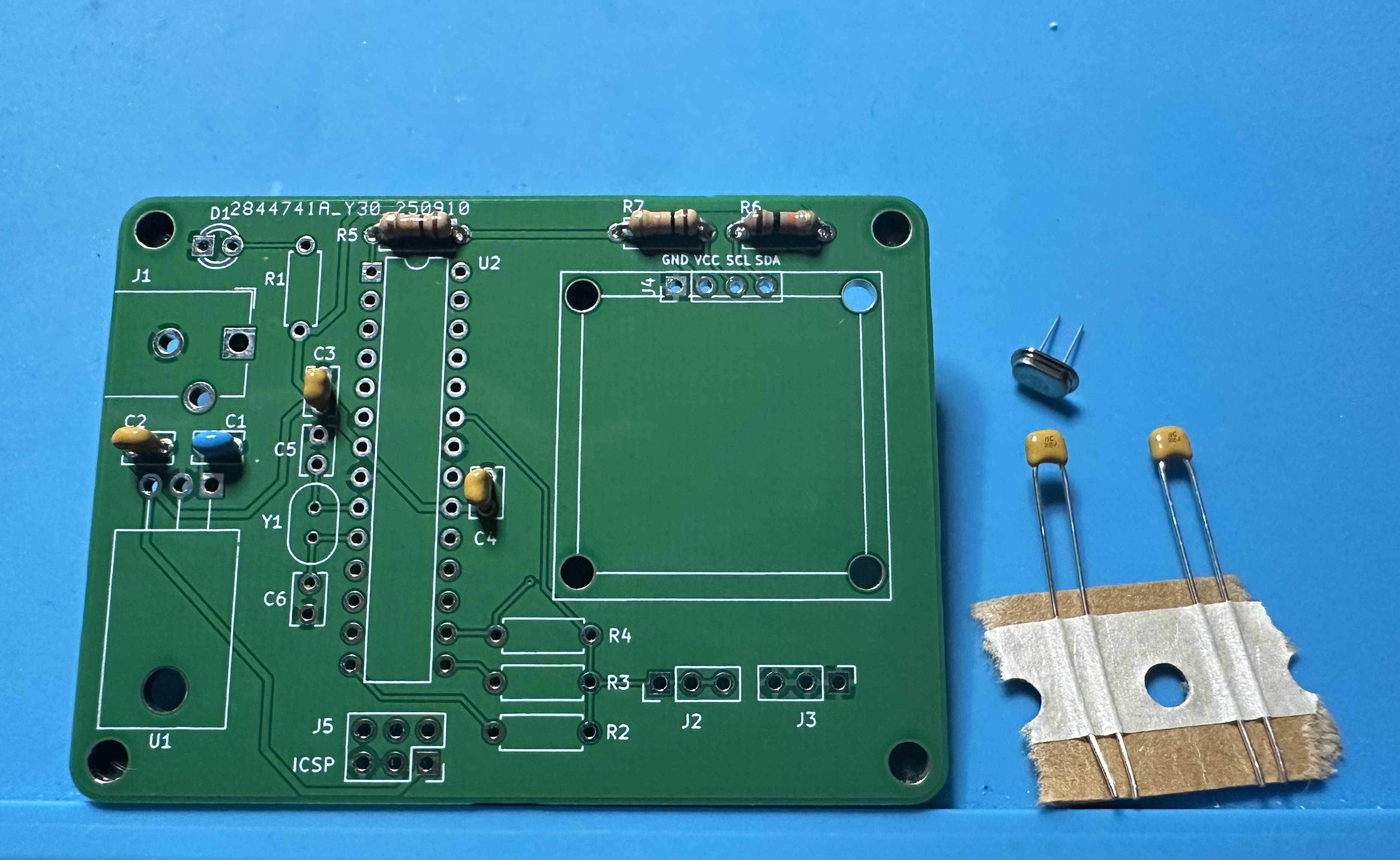 - Now, let's do the 16-MHz oscillator crystal (Y1) for the microcontroller and associated 22-pF (22J) capacitors (C5 and C6).