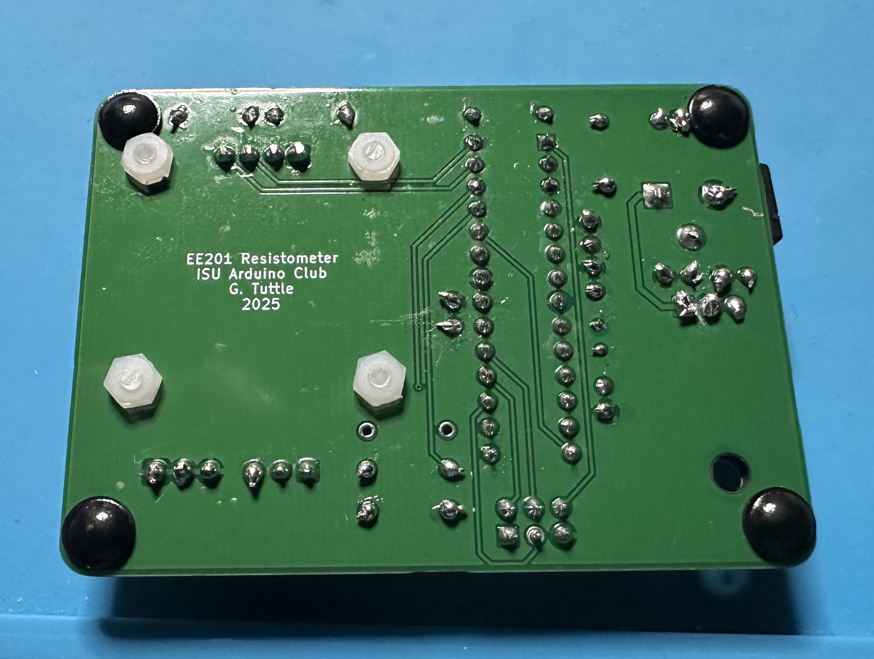 - To finish up, insert the Atmega328 chip into the socket. You can program before installing or after, using the ICSP header. You will probably have to fiddle with the leads, bending them in a bit so that all leads fit into the socket. Don't force it! Once the chip is programmed, attach a battery and start measuring resistors!