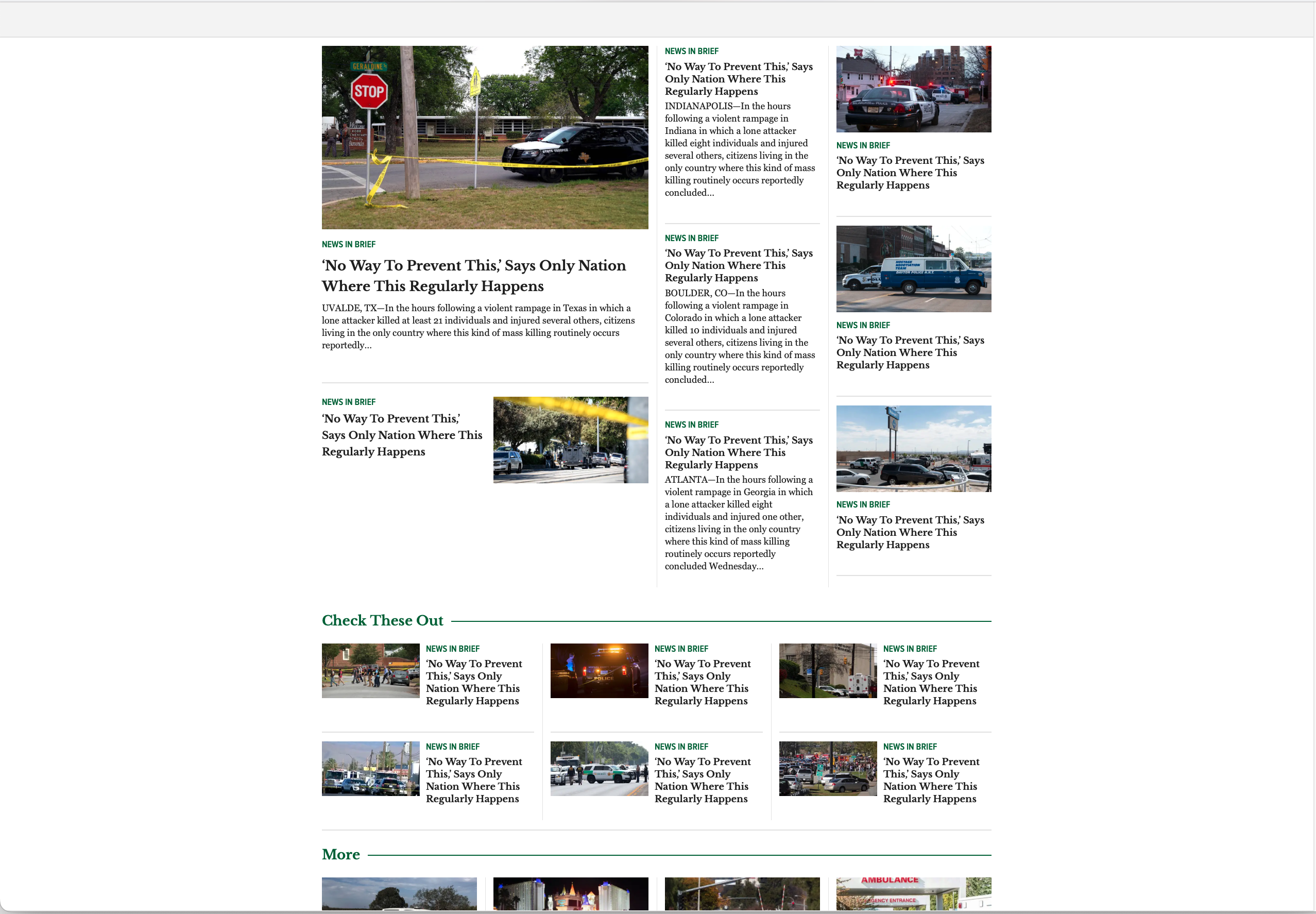 - The Onion re-prints their " 'No Way To Prevent This,' Says Only Nation Where This Regularly Happens" article, but taken to a new level. Their front page will probably change soon to keep up with the all the ongoing nonsense, so here a screen shot.