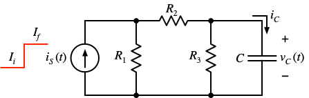 In the RC circuit, the source current has been at an initial of Ii = 10 mA for a long time. At t = 0, the source current abruptly jumps to If = 0.18 A.